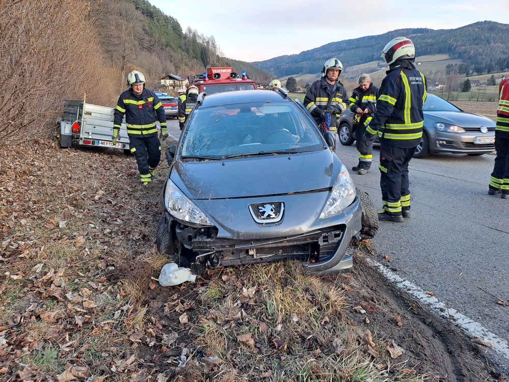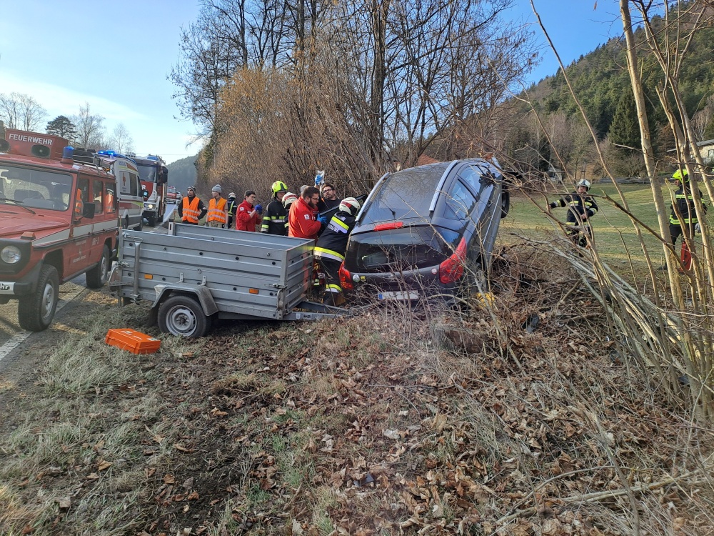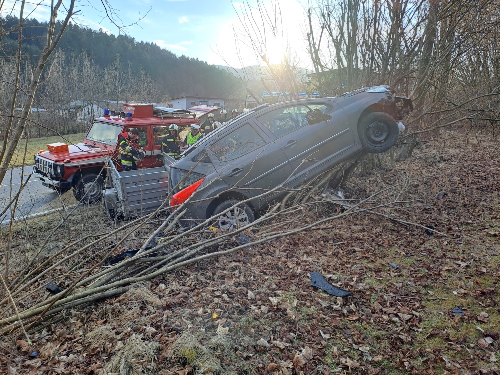 Sirenenalarm für die Feuerwehren Kirchberg und Feistritz am Mittwoch Nachmittag. Auf der L134, kurz vor dem Hammerwald auf der Au, ereignete sich ein schwerer Verkehrsunfall. Ein PKW-Lenker fuhr von Feistritz kommend Richtung Kirchberg und kam aus ungeklärter Ursache von der Straße ab. Mit hoher Geschwindigkeit fuhr der PKW auf die Straßenböschung auf und krachte schlussendlich in eine Strauchgruppe.